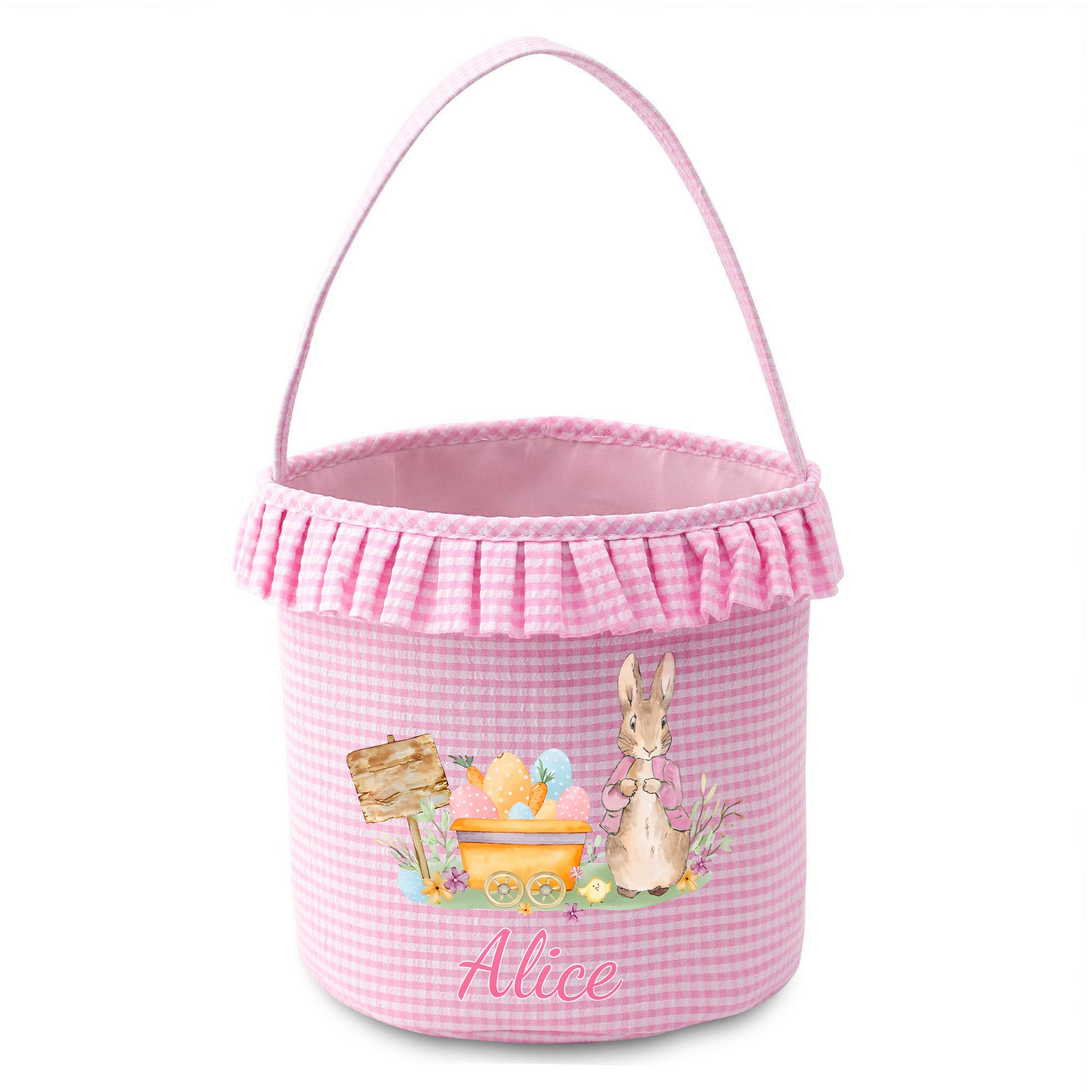Whimsical Peter Rabbit Design - This Easter basket features a sweet Peter Rabbit surrounded by colorful eggs and carrots cart on classic gingham fabric. The soft ruffle trim adds a playful touch, while bright multicolor details bring a cheerful spring feel that children instantly love.